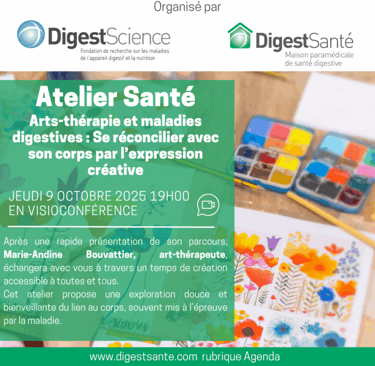 Dans le cadre de mon partenariat avec la Fondation DigestScience, j'aurai le plaisir d'animer un nouvel atelier santé sur le thème "Se réconcilier avec son corps par l'expression créative" le 9 Octobre prochain. Cette séance découverte s'adresse à toutes les personnes curieuses de découvrir l'art-thérapie, en particulier celles qui souffrent de maladies digestives.