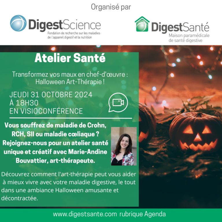 Dans le cadre de mon partenariat avec la Fondation DigestScience, j'aurai le plaisir d'animer un nouvel atelier santé sur le thème "Transformez vos maux en chef-d’œuvre" le 31 Octobre prochain. Cette séance découverte s'adresse à toutes les personnes curieuses de découvrir l'art-thérapie, en particulier celles qui souffrent de maladies digestives.